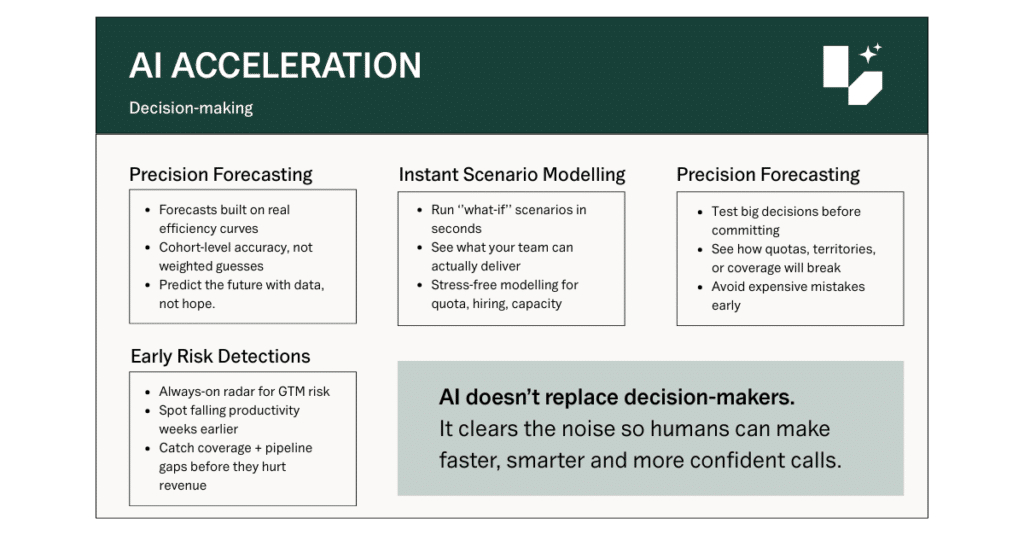 AI’s power lies in its ability to go beyond simple averages and intuition. It builds forecasts with surgical precision by identifying subtle shifts in rep ramp times, attainment cohorts and regional variance across millions of data points. This allows GTM leaders to treat their planning like a simulator.