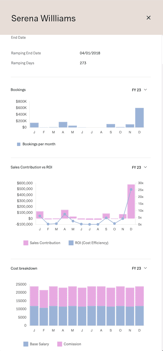 Unlock the full potential of your sales team with our enhanced sales rep profiles. Now with added graphical depictions of sales contributions and ROI, these profiles not only celebrate successes but also highlight areas for development. This visual approach makes performance reviews more insightful and actionable, fostering a culture of continuous improvement and success