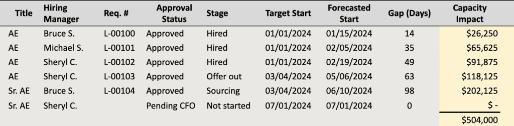 The example above illustrates the impact of hiring delays. Finance and RevOps might align on a hiring plan with expected start dates, but delays frequently arise from the hiring team’s late awareness of job requisitions, challenging timely hiring. In this example, these delays can risk over $500k in annual bookings.