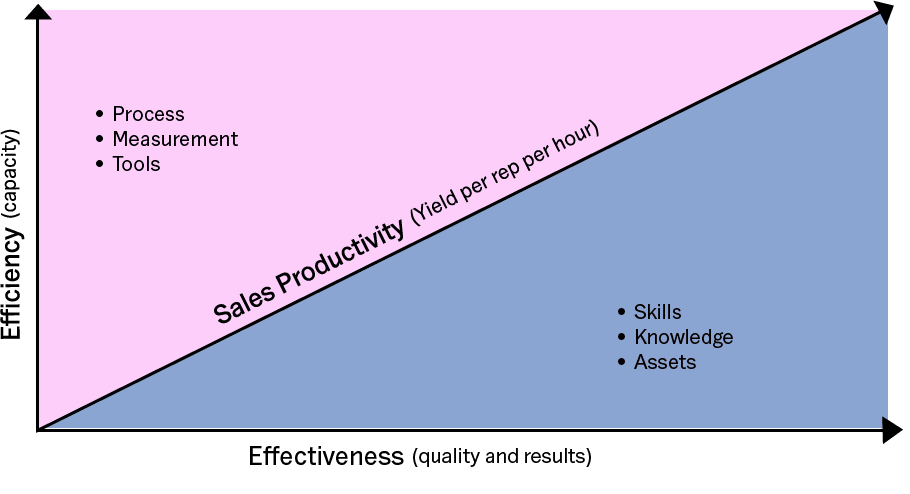”Sales and sales operations leaders often struggle to define sales productivity, defaulting to such measures as the number of sales reps who achieve quota, the size and conversion rate of opportunities in the pipeline, or the win rate for qualified opportunities. All of these metrics are important, but they rarely appear as corporate level goals, which are typically stated as revenue and operating margin. The ultimate yield, or result, of the sales organization is revenue and profits. Defining sales productivity as the yield per rep per unit of time directly links the goal of increasing sales productivity to corporate-level goals. The efficiency, or yield per rep per hour, with which the organization can achieve results is directly related to operating margin (i.e., profitability)”