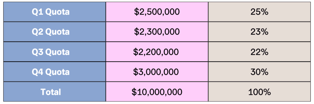 Step two is determining your seasonality and how you distribute the quotas across the months and quarters for each year. You would generally follow how the business has previously come in, so for example if the prior Q1 bookings was 22% of the annual number then you could expect something similar in the next year. It’s not always easy to change and more than likely will need to be done incrementally so for example if you want Q1 to be 28% in a future year, then start by getting to 25% first. I would also advise to avoid the ‘hockey stick’ effect in the third month of each quarter and rather distribute the quotas more evenly across the months within the quarters so something like this 30%/30%/40%. You also need to factor in the holidays, etc as in Europe you would adjust July and August down to reflect the impact on the business. It’s therefore important to set your seasonality by region/country as it can be quite different depending on where you are in the world.