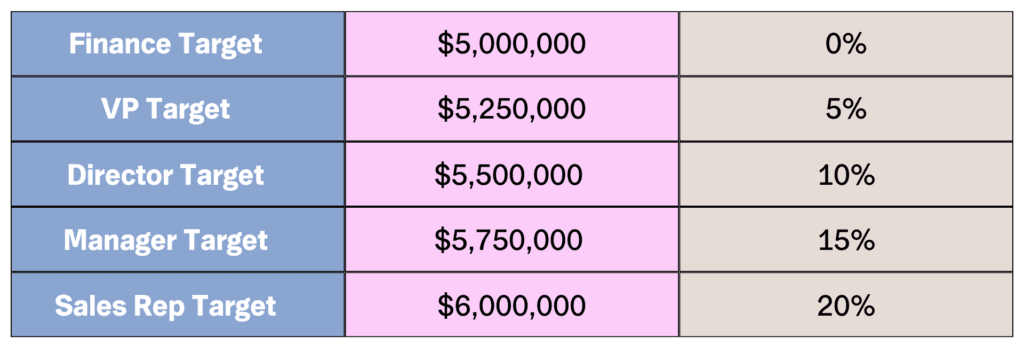 This over-assignment ensures that the organization aims higher than its baseline financial target, driving ambition across the sales hierarchy and accommodating for potential shortfalls like people leaving the organisation or changes that need to be made due to strategic shifts within the business.